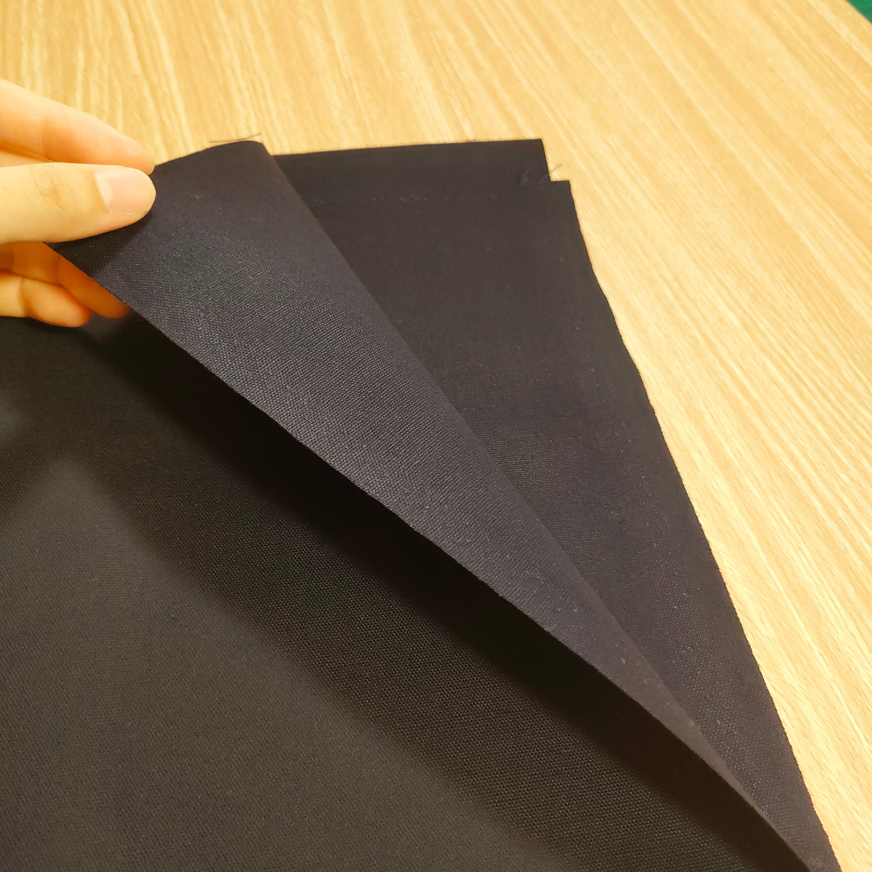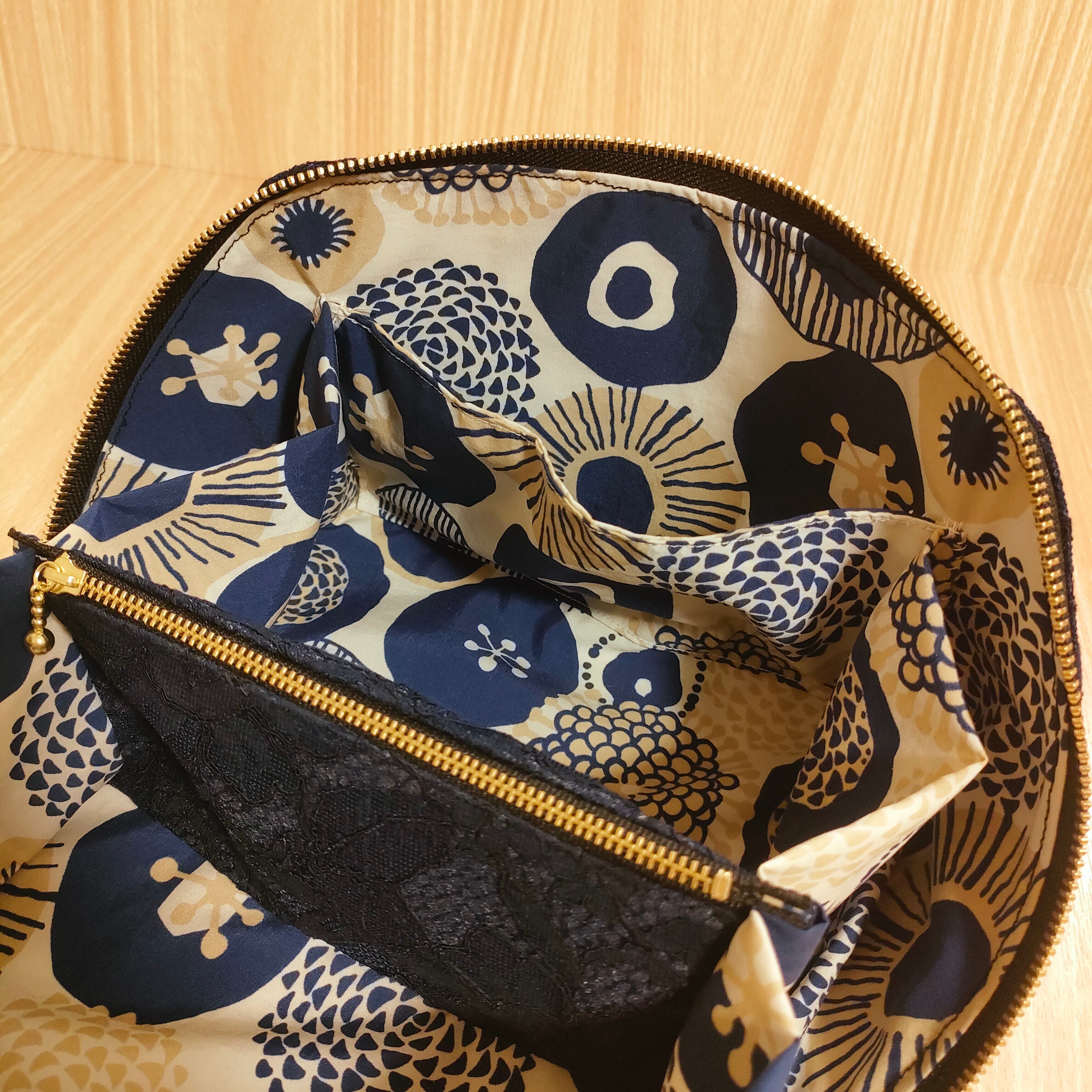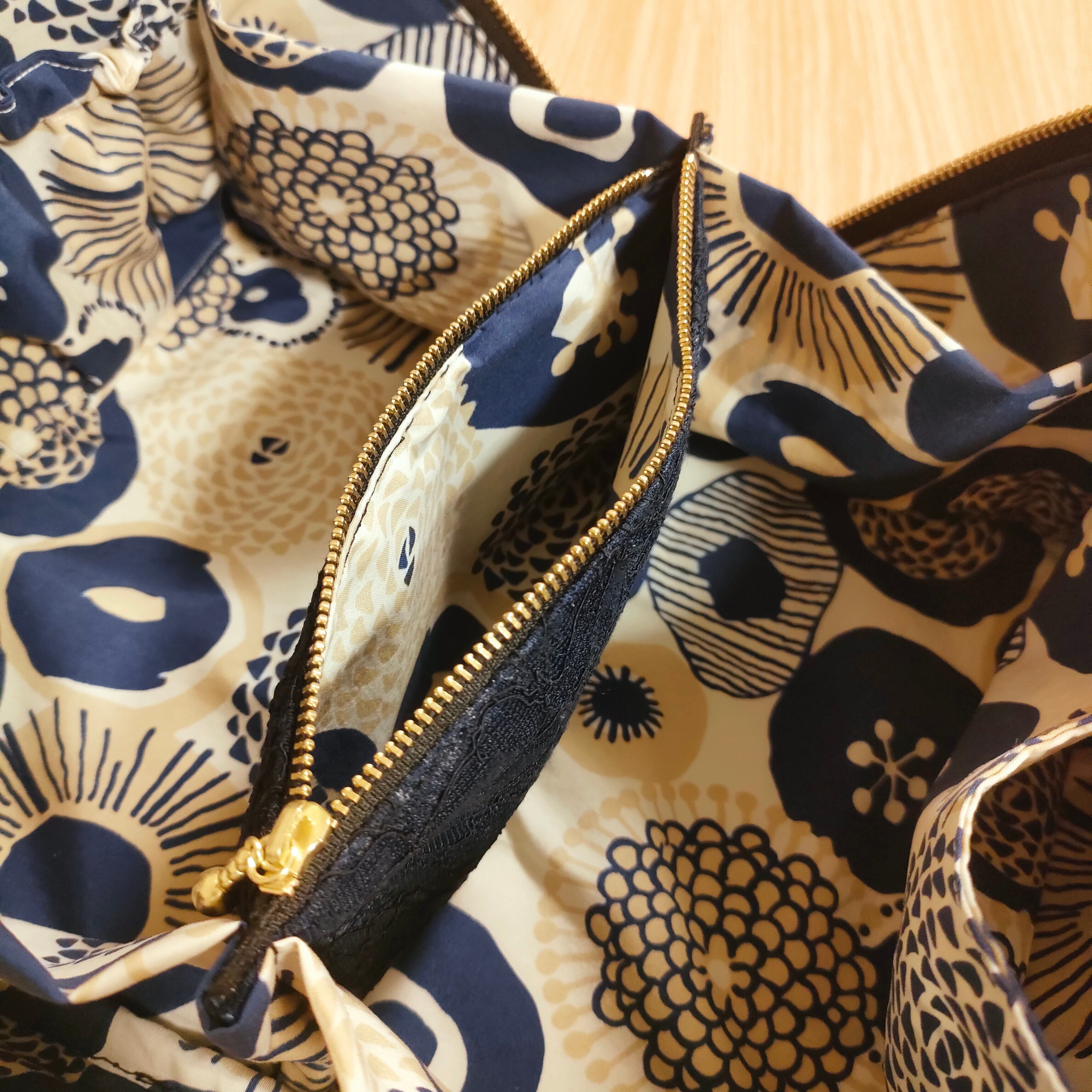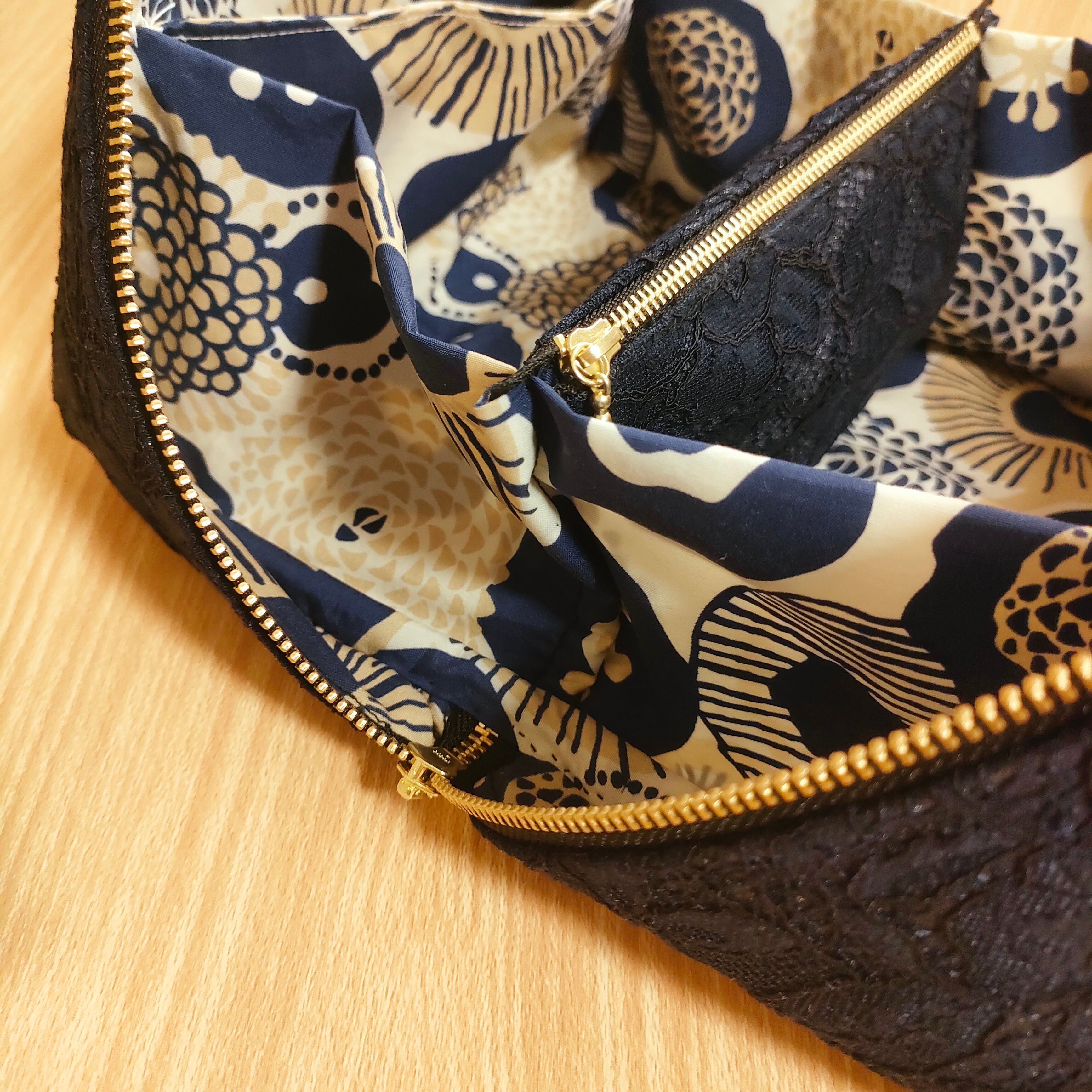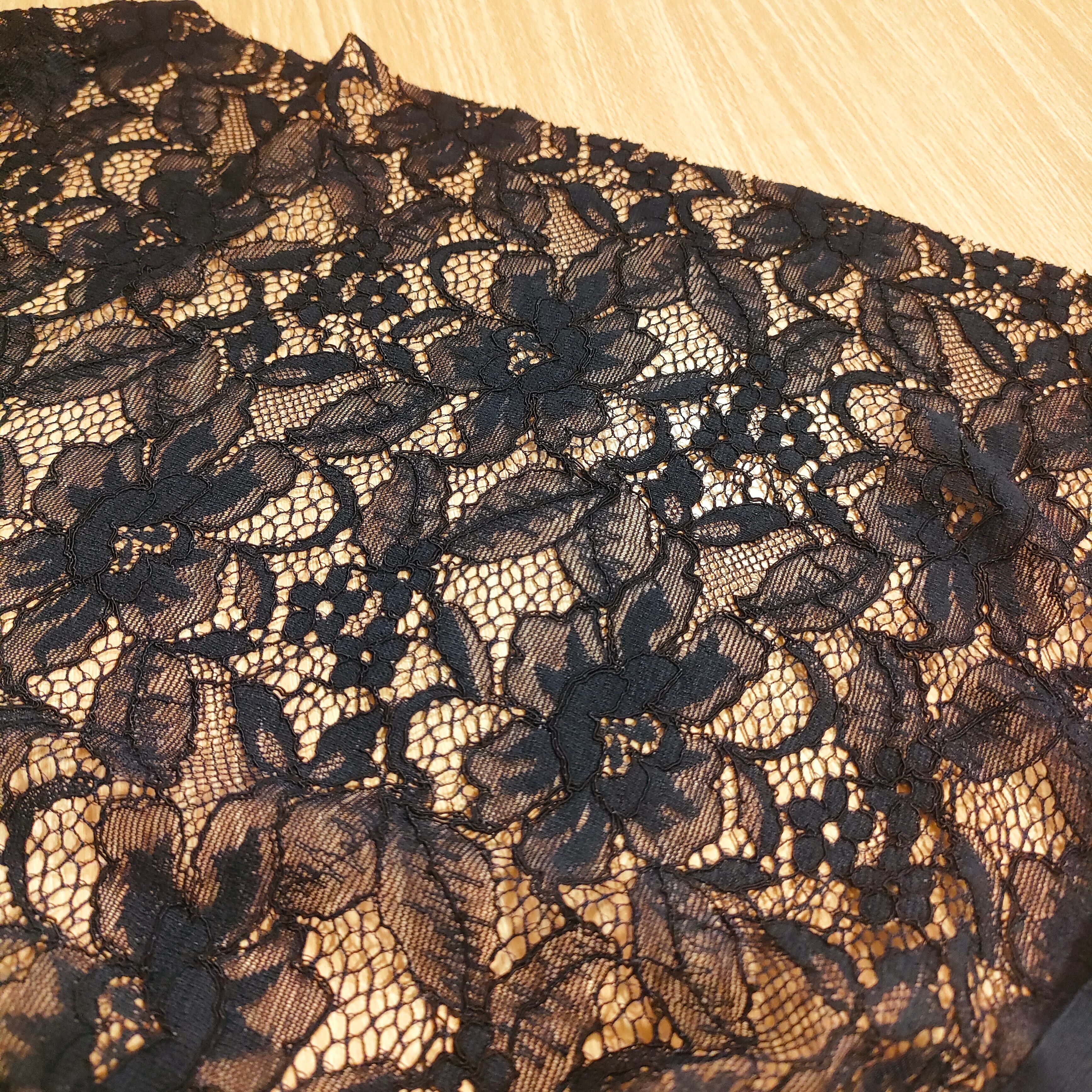 A deep navy cotton base is layered with delicate black lace, carefully fused using double-sided interfacing.