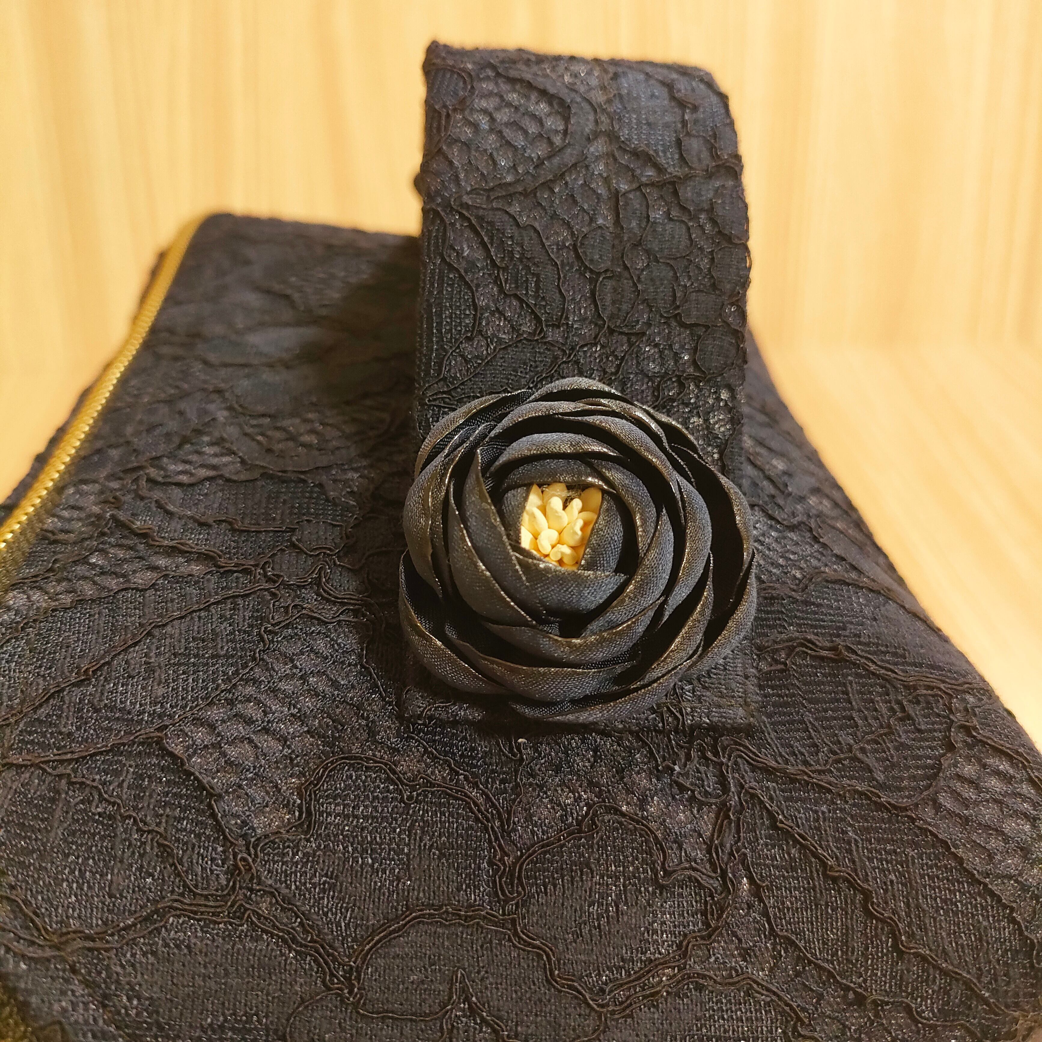 Two hand-crafted roses made from the same lace fabric are attached to the handle,